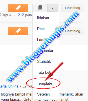 - Setelah masuk ke blogger, anda akan melihat dasbord blog anda. Untuk mengedit template, klik tanda panah ke bawah yang ada di dekat nama blog lalu klik tab "Template".