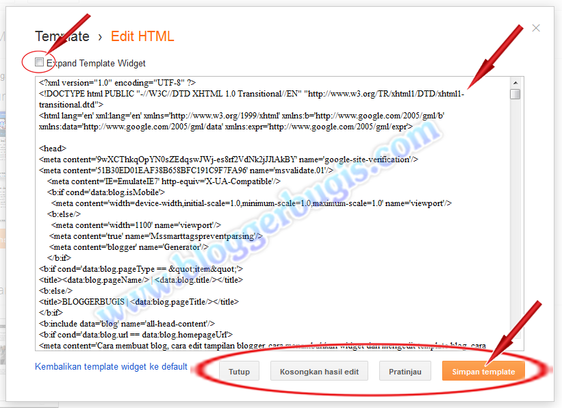 - Anda akan melihat kode HTML template blog anda. Silahkan edit sesuai keinginan. Jika di perlukan, beri tanda checklist pada kotak kecil yang ada di dekat tulisan "Expand Template Widget" dengan cara mengklik kotaknya.