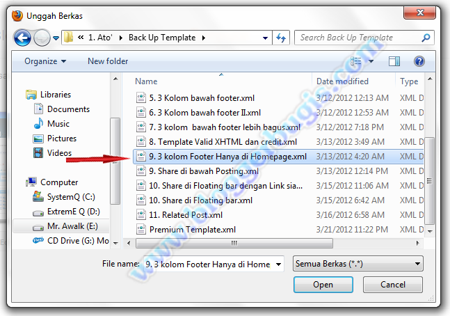 - Selanjutnya ikuti proses download. Jika menggunakan browser Mozilla Firefox, anda hanya tinggal memilih "Simpan Berkas" lalu klik "OK" pada jendela download. Anda juga bisa mengupload kembali template anda yang telah di backup / di download ( biasanya untuk mengganti template atau mengembalikan kode template karena gagal atau melakukan kesalahan saat megedit template ) dengan mengklik tombol "Telusuri". Selanjutnya cari template / backup template yang ada di hardisk anda, klik open, lalu klik tombol "Unggah".